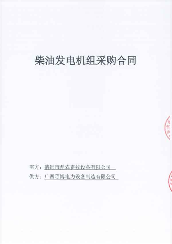 2020年12月31日,在這2020年的最后一天,廣西頂博電力設備制造有限公司再度傳來好消息,頂博電力與清遠市鼎農(nóng)畜牧設備有限公司成功簽訂兩臺柴油發(fā)電機組,分別是50KW玉柴柴油發(fā)電機組一臺和100KW玉柴柴油發(fā)電機組一臺。