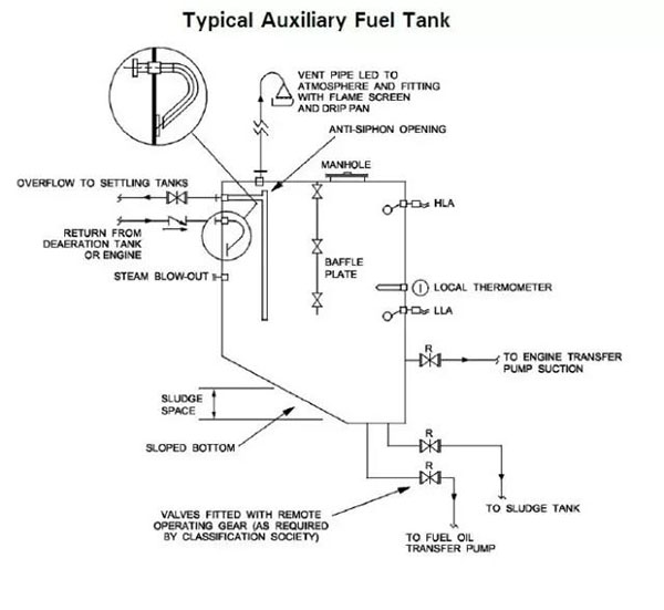 如果將溢油管接至緊急回油泵出口,開啟回油泵排油的同時可能引起柴油通過溢油管返回至日用油箱,無法快速有效地將柴油排空。